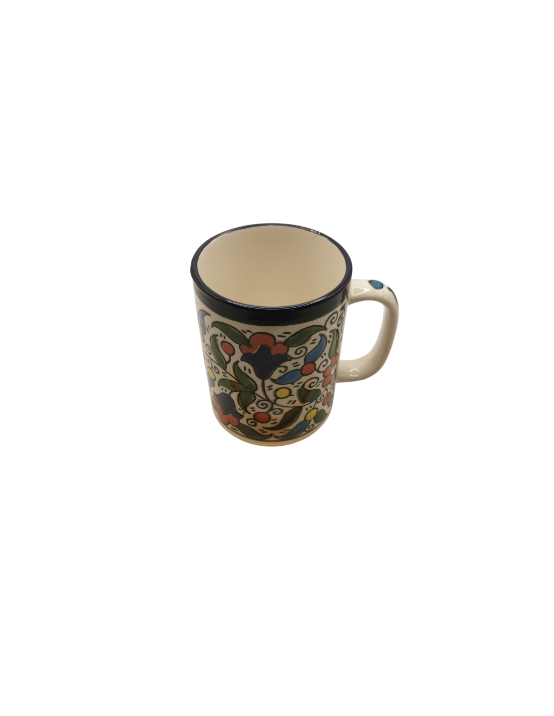 كوب خزفي مزين بنقش تقليدي متعدد الألوان، مصنوع يدويًا في مدينة الخليل وفق تقاليد الحرف الفلسطينية العريقة. يتميز بزخارف مرسومة يدويًا تعكس جمال فن الخزف الفلسطيني وتضفي لمسة من الحيوية والأصالة على مائدتك.