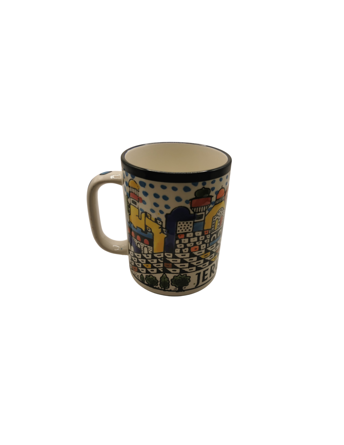 Keramikbecher mit einer Darstellung der Jerusalemer Stadtansicht, handgefertigt in Hebron nach traditioneller palästinensischer Handwerkskunst. Die handgemalten Motive, inspiriert von der historischen Schönheit der Heiligen Stadt, machen ihn zu einem praktischen Alltagsgegenstand und zugleich zu einem besonderen Erinnerungsstück.