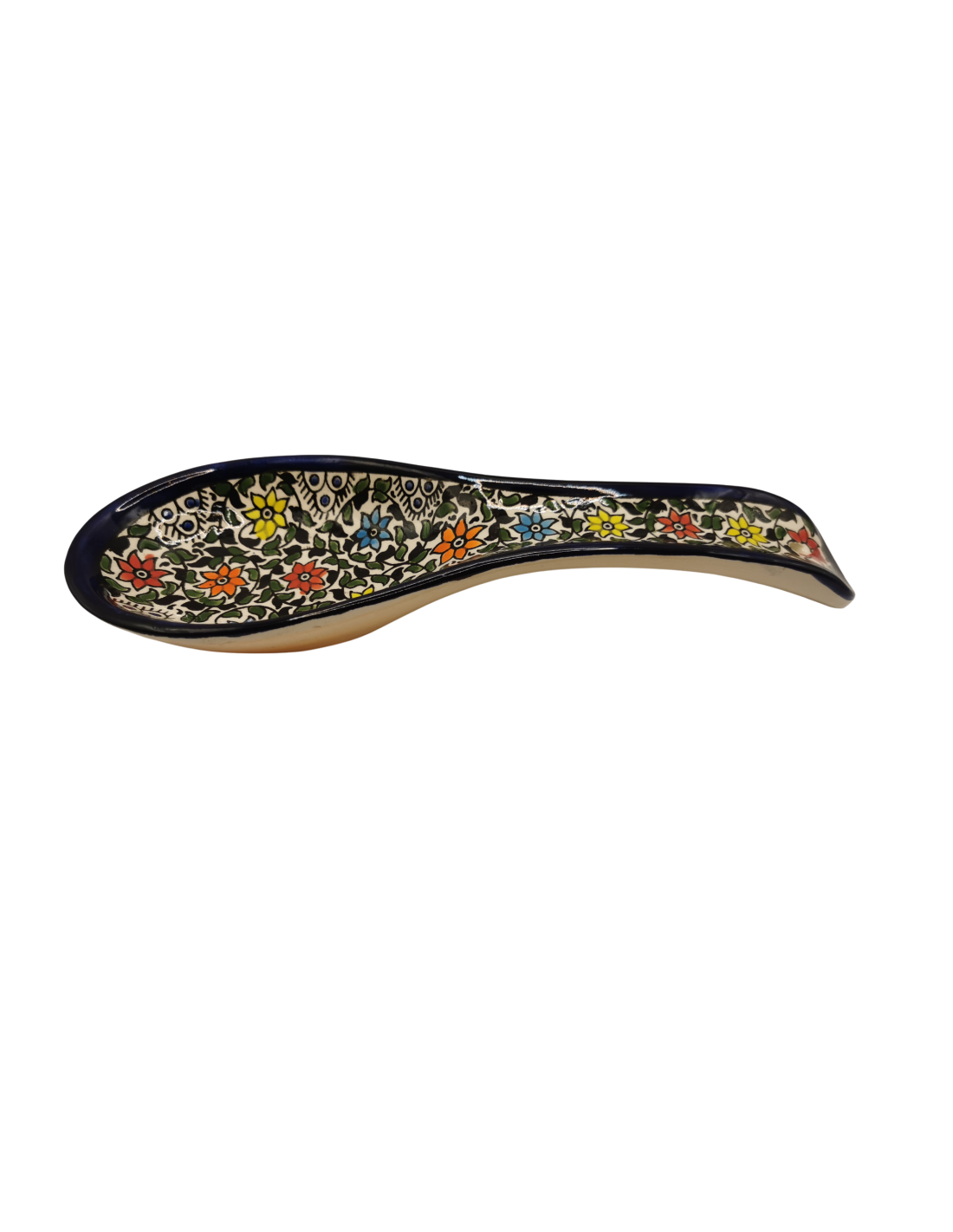 Handcrafted in Hebron, this ceramic spoon rest features a flowing shape decorated with a vibrant multicolor traditional pattern. Carefully hand-painted by local artisans, it combines practical use in the kitchen with the rich artistic heritage of Palestinian ceramics.