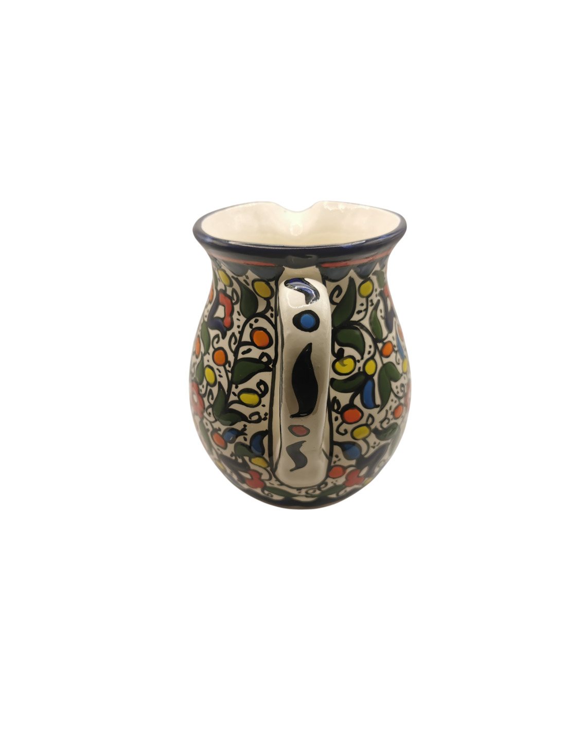 Pichet en céramique décoré d’un motif floral multicolore, fabriqué à la main à Hébron selon un savoir-faire artisanal palestinien. Ses motifs peints à la main reflètent la richesse de l’art céramique palestinien et en font un objet aussi pratique que décoratif.